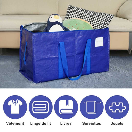 Robustes et réutilisables, ces sacs sont fabriqués en matière plastique renforcée ou en tissé polypropylène, selon les modèles. Leur structure permet de transporter des charges plus lourdes qu’un sac classique, tout en restant légers et faciles à manipuler. Grâce à leur grande capacité, ils accueillent aisément linge de maison, vêtements, jouets, housses de couette, oreillers, chaussures ou petits équipements domestiques.