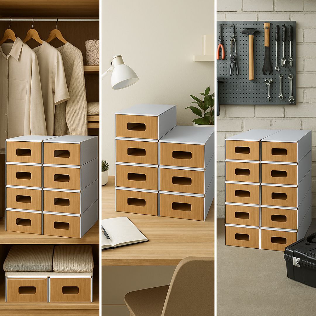 Fabriquée à partir de carton robuste et livrée en montage ultra-simple, elle se glisse sous un lit, dans un placard, sur une étagère ou dans un dressing. Son format compact et son habillage soigné en font un choix idéal pour un usage multi-pièces (entrée, chambre, bureau, garage).